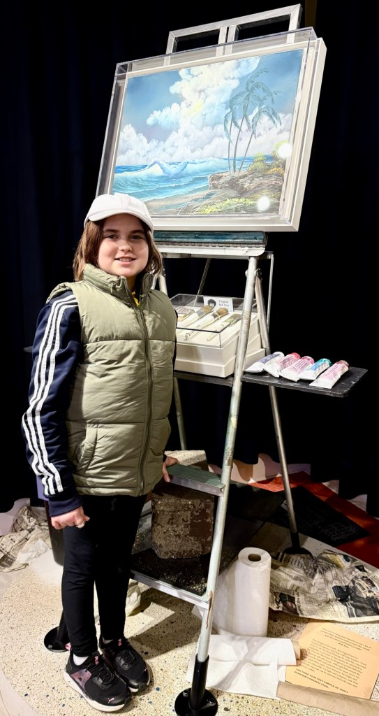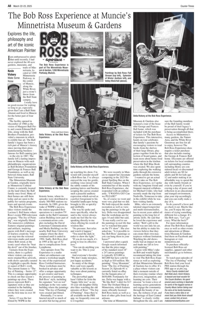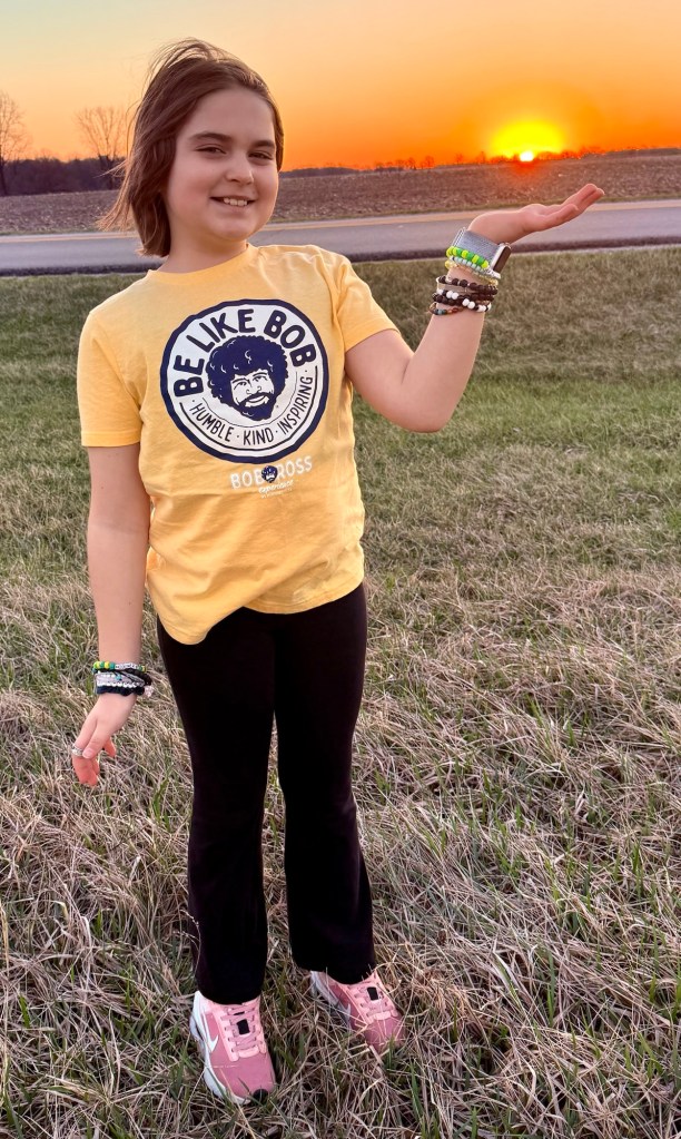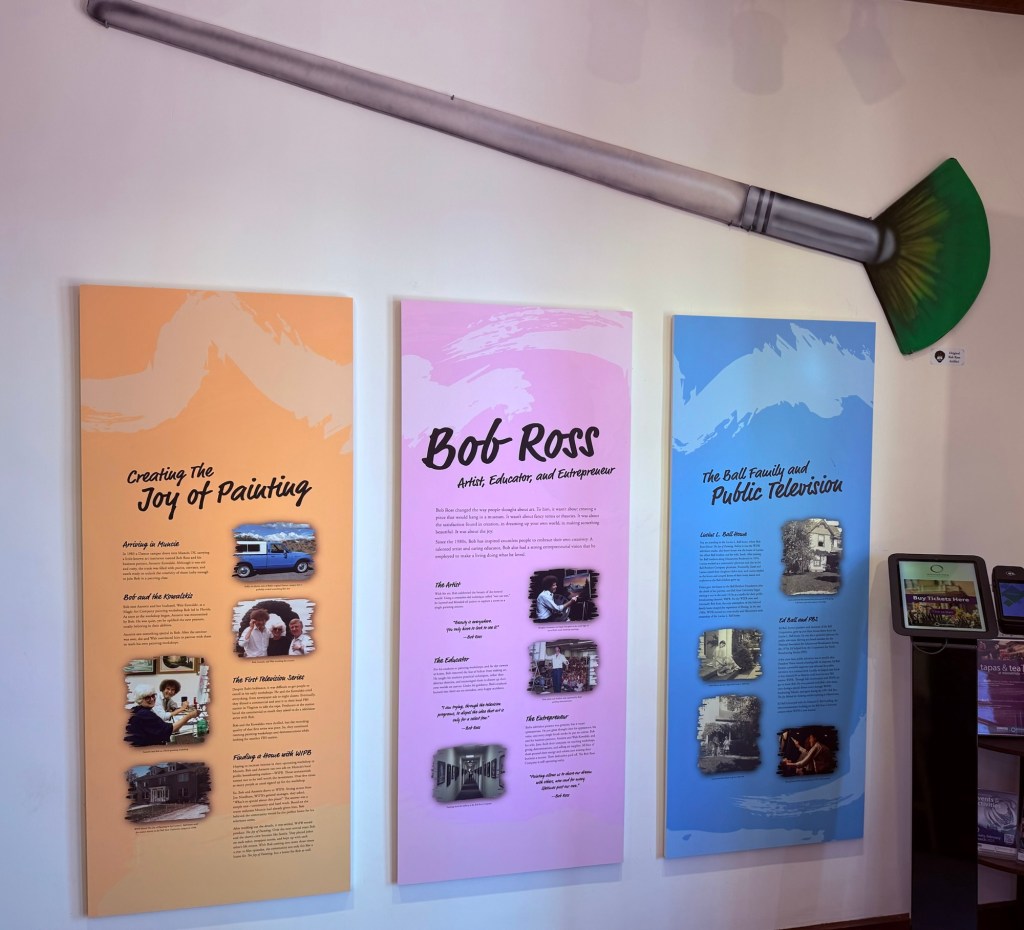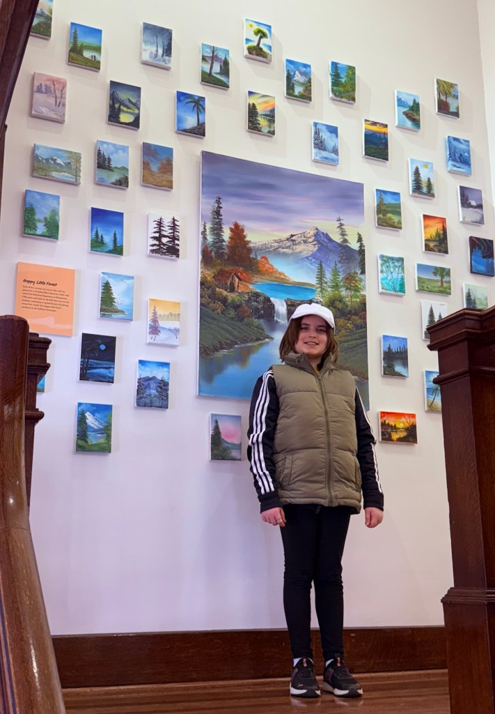 The proverbial apple hasn’t fallen far from the “happy little tree” as my 10 year old daughter, Delia also likes watching the old episodes of Ross’ “The Joy of Painting” and since they’re all available on the PBS app, we frequently zone out to it together. We were recently in Muncie to support her classmate competing in the 2025 Regional Spelling Bee on the Ball State Campus, and when I reminded her of the nearby Bob Ross Experience, she responded with an enthusiastic, “I WANNA GO! Can we PLEASE!