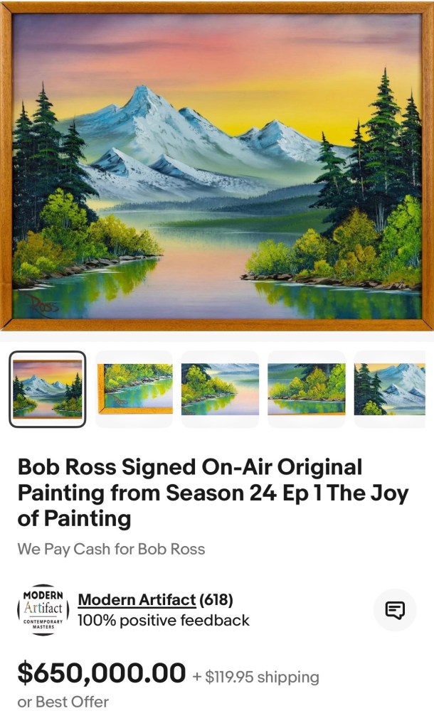 So, of course we went and were very glad that we did. We both enjoyed the studio recreation as well as viewing the paintings in the gallery. Delia was disappointed that the workshops are for ages 14 and older but said that, “It was really cool to see the paintings in real life that we’ve watched him paint on the TV show”. She also asked me, “Is it possible to buy Bob Ross’ paintings so you can hang them in your house?”. I answered after a quick Google search informed me that the price range of his standard sized 18” x 24”canvas paintings is typically $25,000 to $65,000 but have sold for as high as 10 million. His painting’ “Gray Mountain” from, “The Joy of Painting”, season 24, episode #1 is currently listed on eBay for the bargain price of $650,000. Fortunately for me she was happy with a “Be like Bob” t-shirt for $17.00 from The Orchard Shop at Minnetrista which features many officially licensed Bob Ross items as well as a host of other gifts from local artisans.
