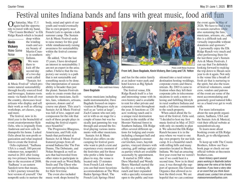 On Saturday, May 17th I again had the opportunity to travel with my band, “The Cousin Brothers” to Elk Ridge Ranch which is located deep within the winding roads and scenic beauty of Martin County in southern Indiana. We were there to kick off the second day of a two day event called “Sustain Art & Music Festival” which promotes natural sustainability through locally sourced food and beverages, features roots music via bands from all over the country, showcases local artisans who display and sell their work as well as offering workshops, art classes, yoga and more.