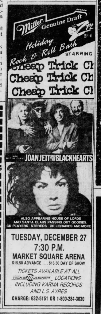 The first and only other time I was able to see Joan Jett in concert was on December 27th, 1988 at good ole Market Square Arena. She was the opening act for Cheap Trick on that tour promoting her album, “Up Your Alley” which featured the hit single, “I Hate Myself for Loving You” which had earned her a Grammy nomination in 1988.