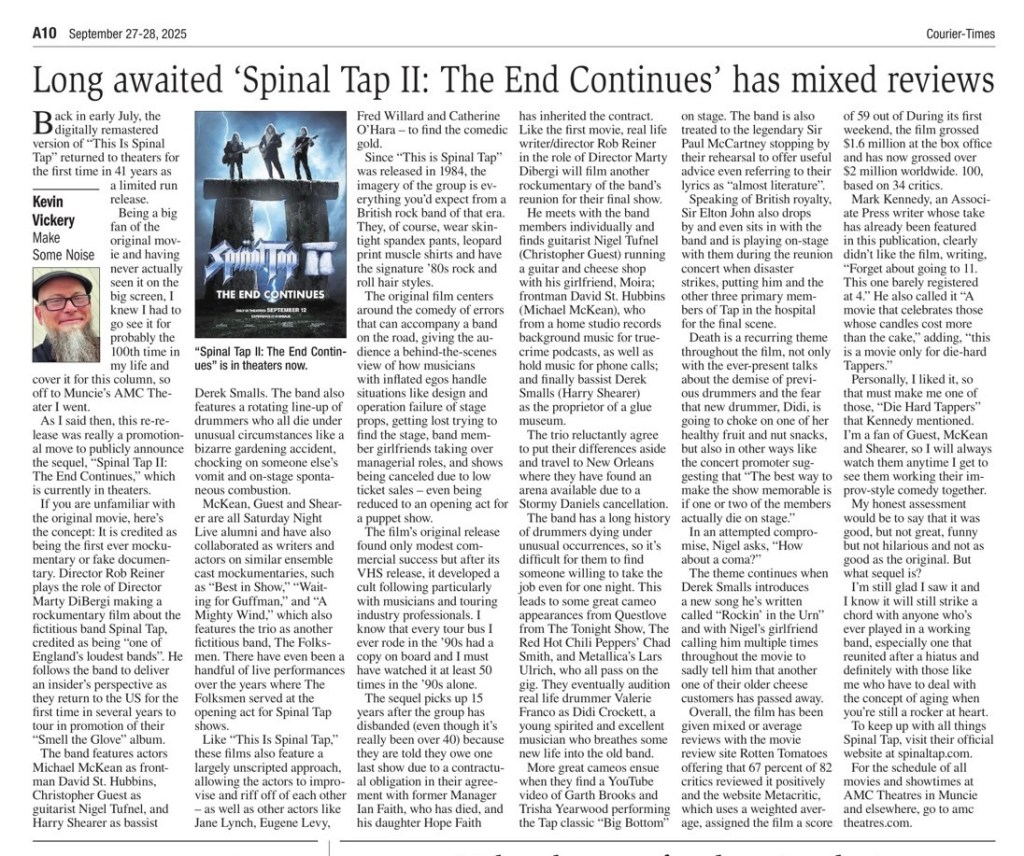 Back in early July the digitally remastered version of “This is Spinal Tap” returned to theaters for the first time in 41 years as a limited run release. Being a big fan of the original movie and having never actually seen it on the big screen, I knew I had to go see it for probably the 100th time in my life and cover it for this column so off to Muncie’s AMC Theater I went. As I said then, this re-release was really a promotional move to publicly announce the sequel, “Spinal Tap II: The End Continues” which is currently in theaters.