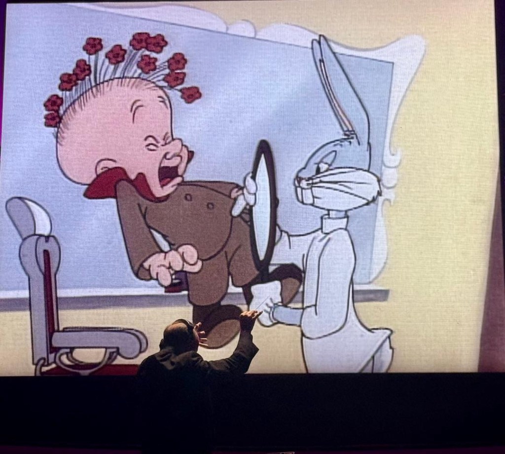 Daugherty told the crowd from stage, “I’ve had a really great career and I’ve worked with a lot of very famous, wonderful celebrities like Julie Andrews, Christopher Plummer and people like that but I have to say that Bugs Bunny is the colleague that I’ve spent the most time with – 35 years and I actually look at the screen while I’m conducting and I have a tendency to think of him as being real”. Adding, “I think of his film persona as being totally here with us”.