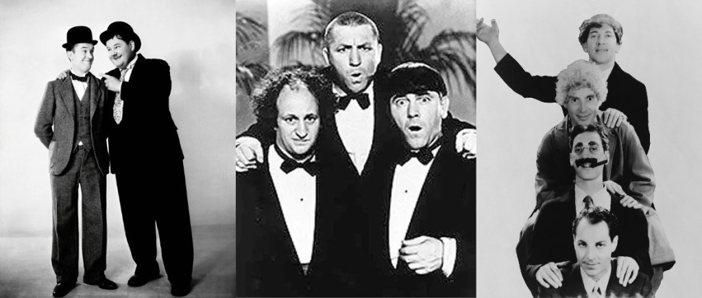 The “whizz, boom, crack” of slapstick started during the silent movie era with artists such as, Charlie Chaplin, Buster Keaton and The Keystone Cops then continued into the mid-20th century with performers such as The Three Stooges, Laurel and Hardy, and The Marx Brothers who carried the tradition forward into sound films.